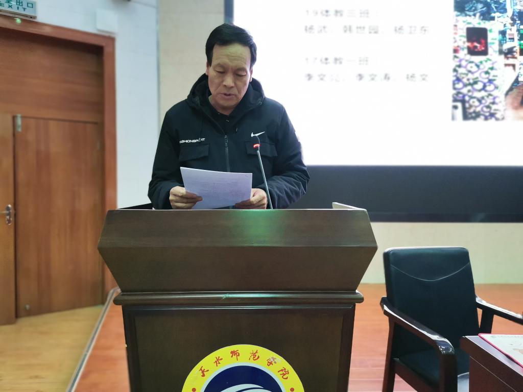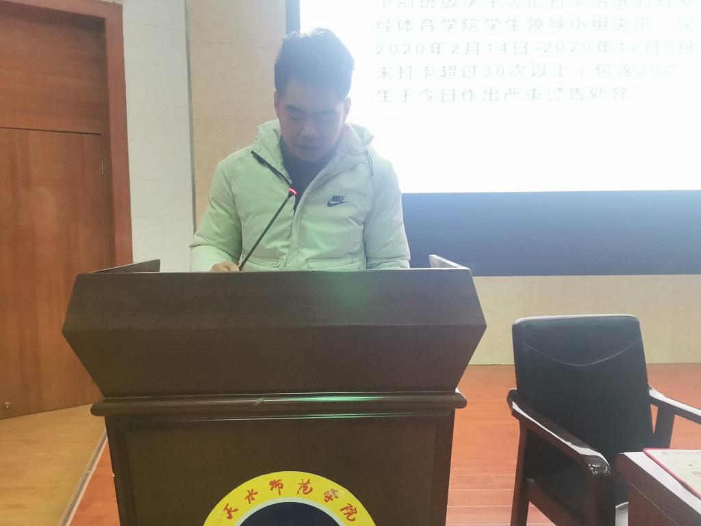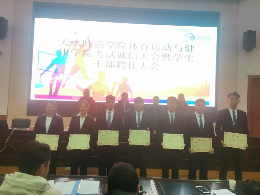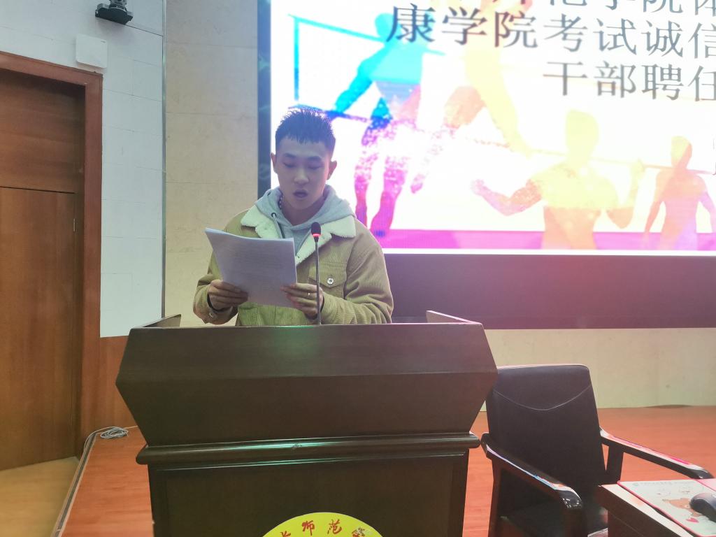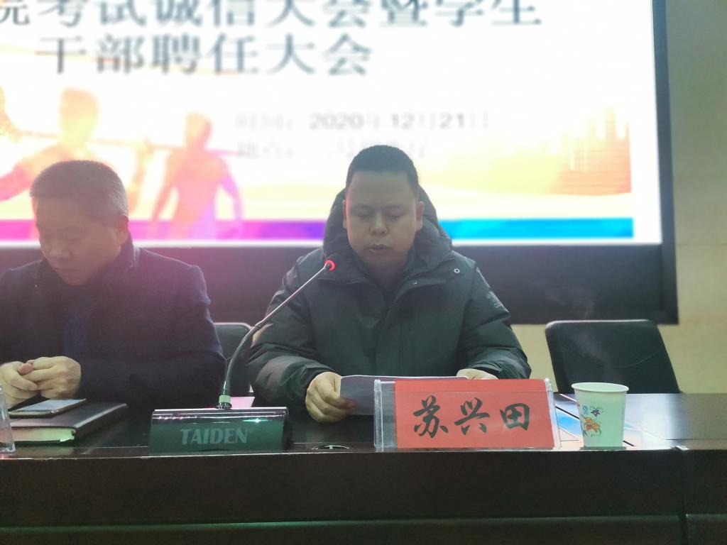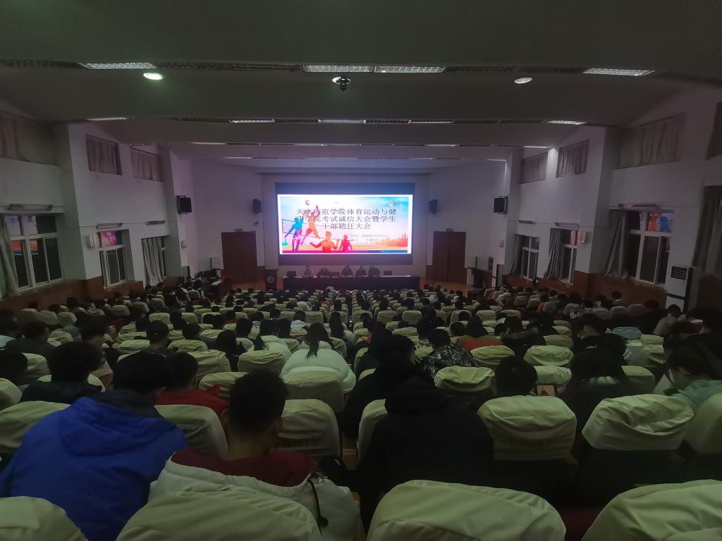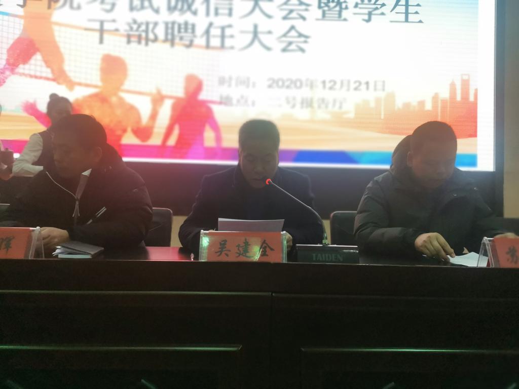 12月21日晚,体育学院在二号报告厅召开考试诚信教育大会暨员工干部聘任大会,公司党政领导班子,各教学系(部)主任,辅导员,19级、20级各班班主任,20级全体员工,以及19级、18级、17级各班员工代表共计370多人参加。大会由学院团委书记王昊支持。