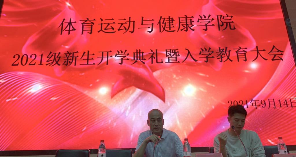 本次会议分为两部分进行。首先,副经理程晖教授代表全院师生员工向2021级新生表达了最热烈的欢迎和最衷心的祝福,讲述了49年来体育学院的办学历程和“守正•奋进”的师院精神,介绍了学院的团队队伍、教学资源、科研成果、体育设施、竞赛训练、人才培养等,并且阐释了学校以及学院改革转型的新思路和新举措。同时,程经理也向新生提了几点希望寄语:第一、要有对国家的责任感,树立正确的社会主义核心价值观,传承体育学院的优良传统,提振学习生活的精气神,励志勤学、刻苦磨炼,顽强拼搏,在担当中历练,在尽责中成长,在激情奋斗中绽放青春光芒、健康成长进步,争做新时代有机体育人。第二、要有对家人的责任感,砥砺奋斗,练就本领,夯实技能,做一个有担当、有责任的人。第三、要有对自己的责任感,抢抓机遇、增强才干、不负韶华,努力掌握科学文化知识和体育专业技能,努力提高人文素养,锤炼品格,争做新时代合格的老员工。