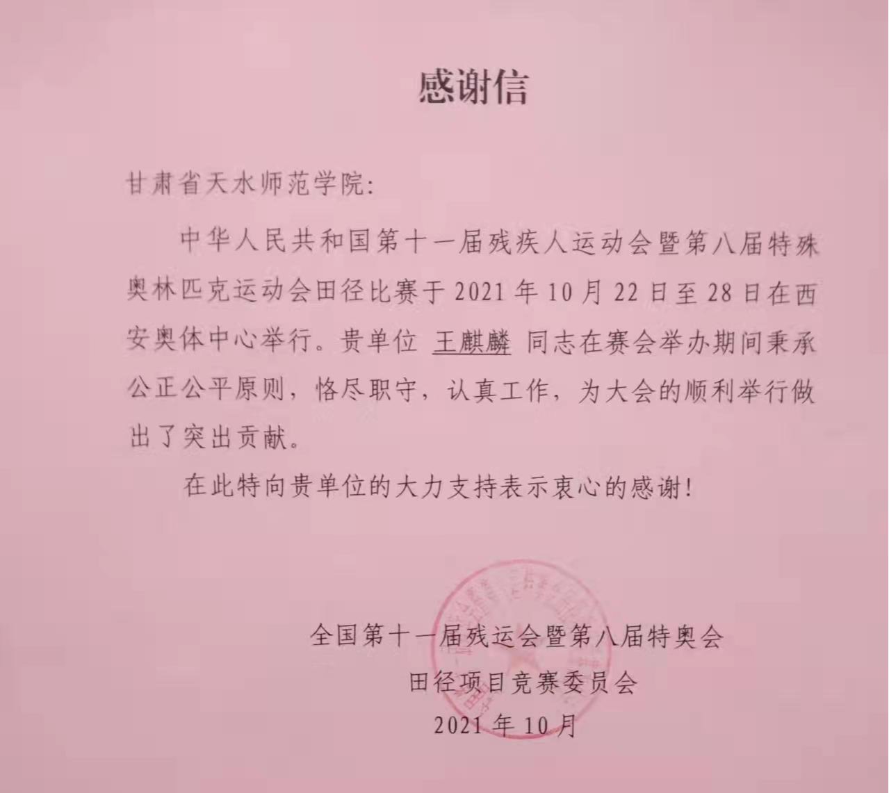 2021年10月22-28日,中华人民共和国第十一届残疾人运动会暨第八届特殊奥林匹克运动会田径比赛在西安奥体中心举行。公司特奥田径国家级裁判王麒麟教授受中残联和国家体育总局选派为田径项目技术官员,并担任田赛裁判长。