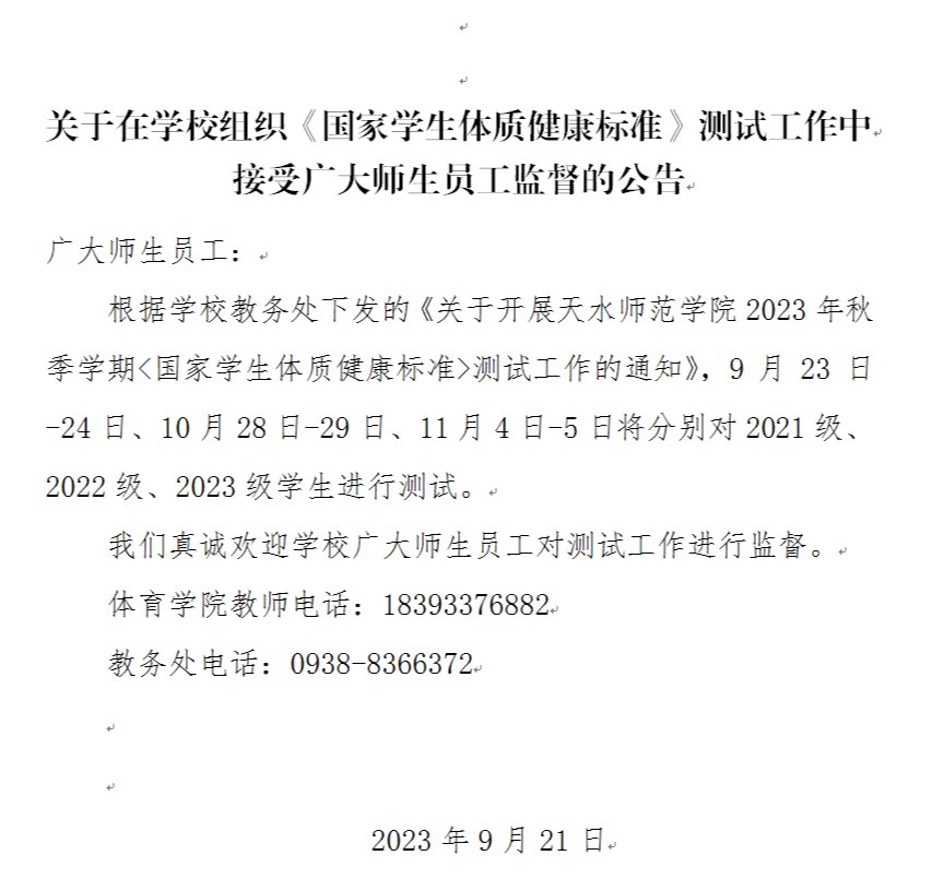 关于在学校组织《国家员工体质健康标准》测试工作中接受广大师生员工监督的公告