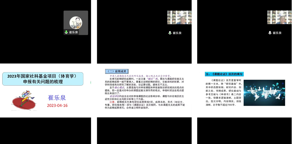 伟德体育以“三抓三促”行动为抓手,积极组织教师申报高级别科研项目,并及时给予指导辅导。4月19日晚,学院邀请中国体育博物馆研究馆员、郑州大学特聘教授崔乐泉在线为教师作2023年国家社科基金项目申报辅导报告。